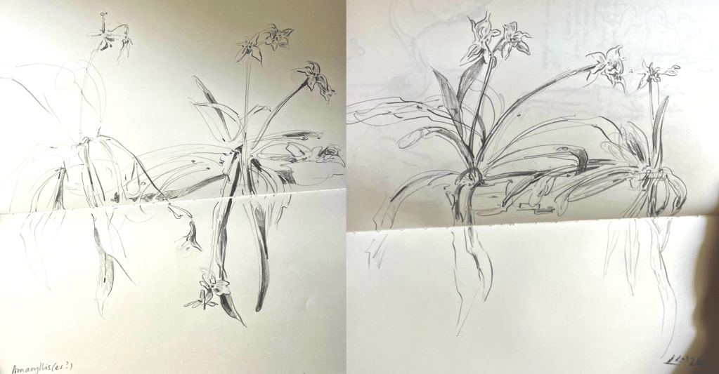 Eventually, I see that the tips of the grand amaryllis blossoms are beginning to darken, and then they begin to shrivel into ringlets. One grand stem leans. I decide to draw it before it starts to droop. And later, the golden square of skylight highlights the blossoms on the other side, and as one plant wilts another blooms, and I have to draw it too.